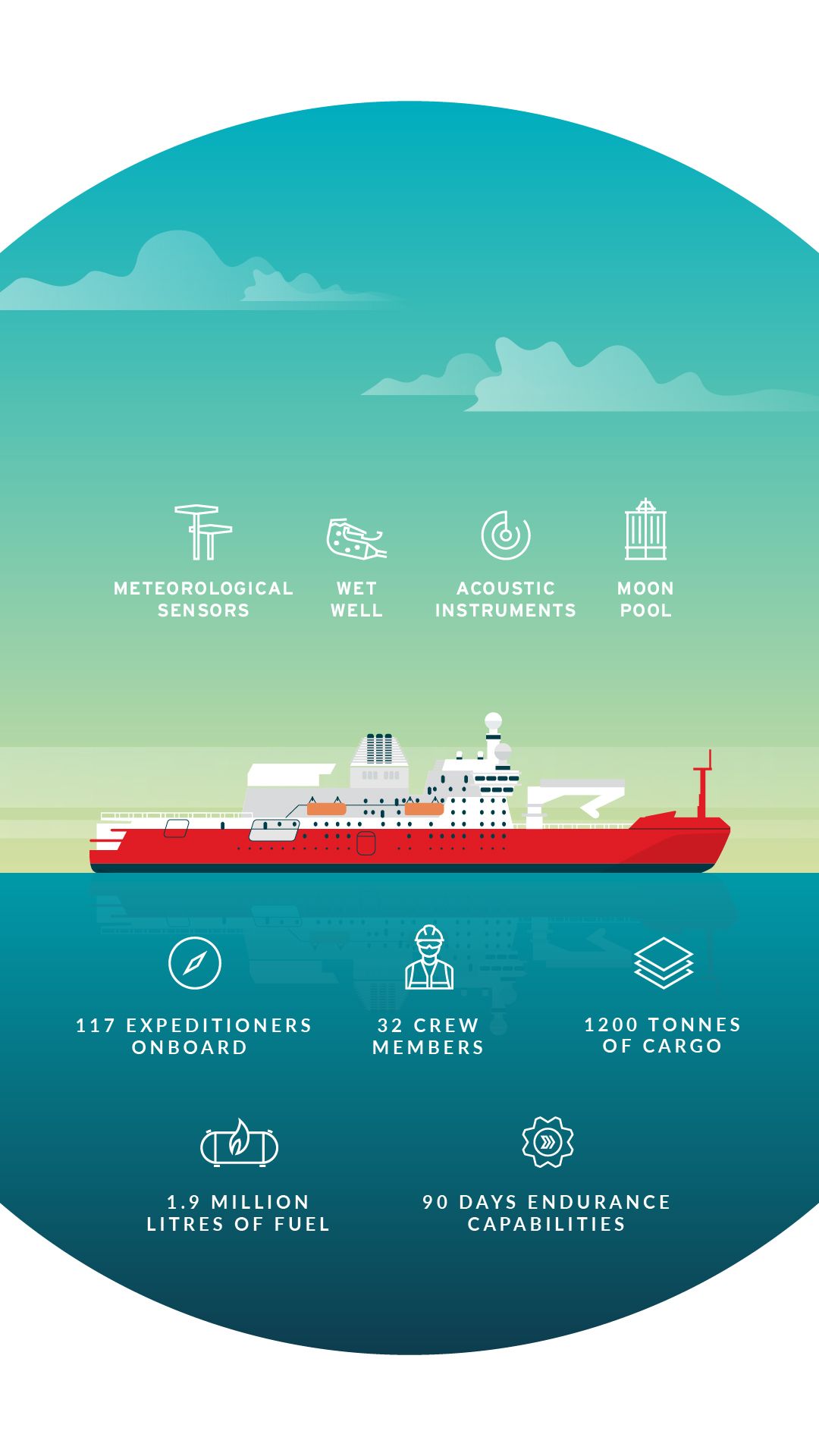 It can carry up to 117 scientists and researchers, and over 30 crew members, while also transporting up to 1200 tonnes of vital cargo for Antarctic research stations and camps. The vessel serves as the perfect scientific arena for those who do the most important research, with a 500-square-foot science deck, electronics workshop and more.