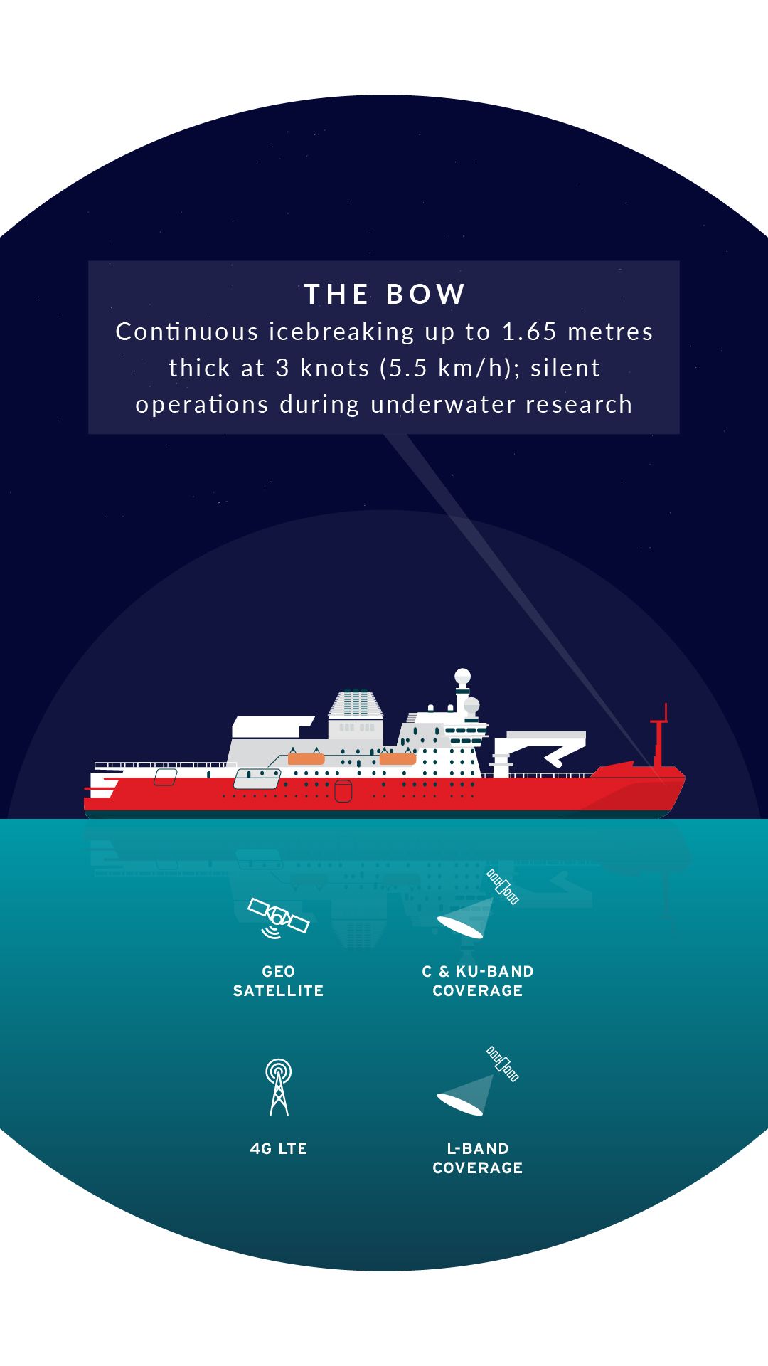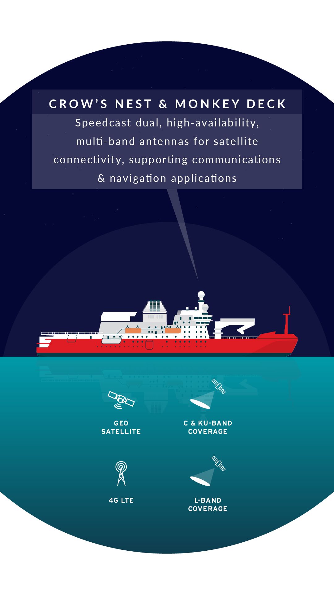 To ensure a seamless connection that accounts for Antarctica's extreme global positioning, GEO satellite coverage is delivered via onboard C- and Ku-band antenna systems. Iridium Certus terminals weather the subzero temperatures and provide L-band safety solutions.