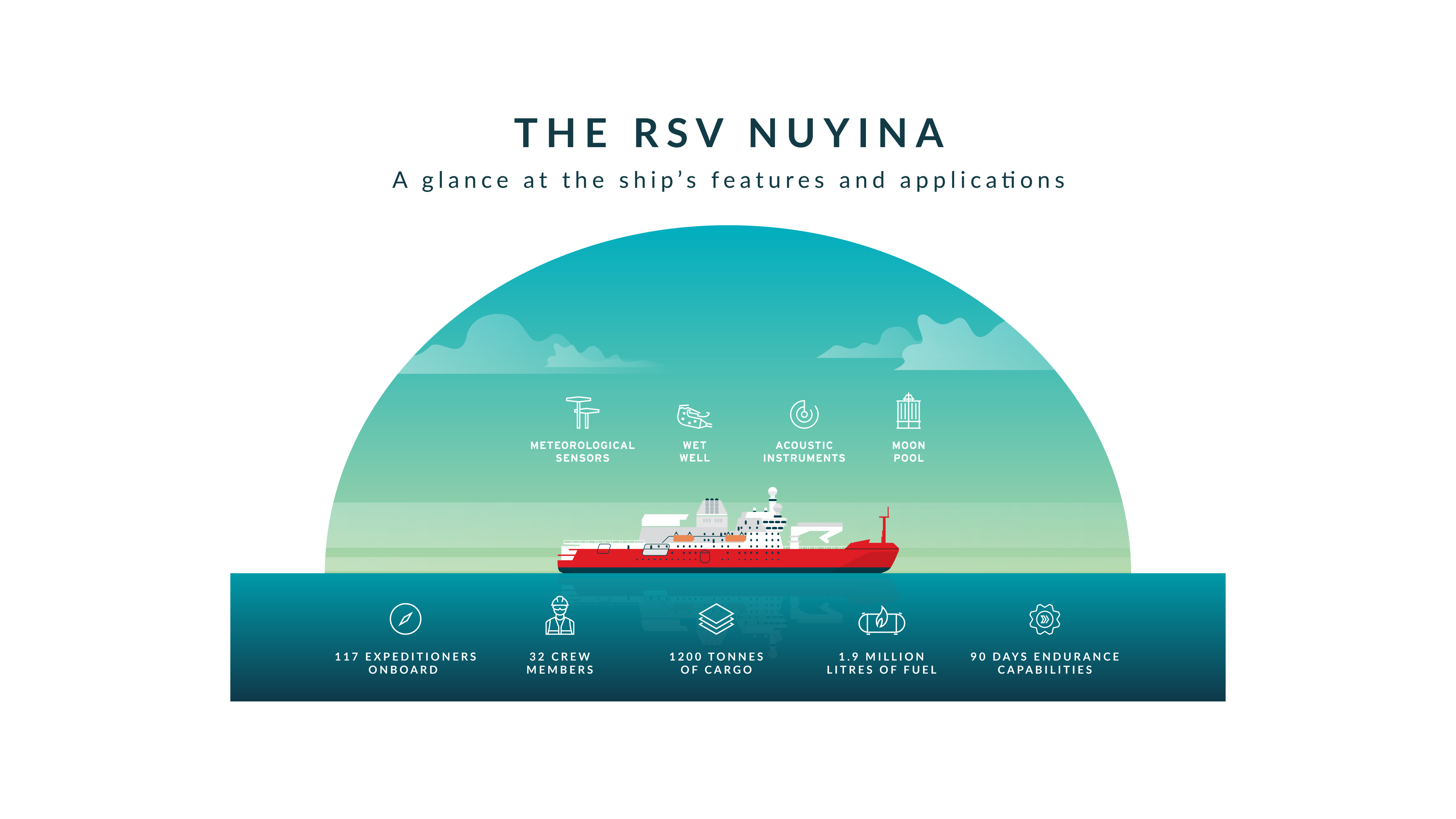 Meaning ‘southern lights’ in the Tasmanian language of palawa kani, the RSV Nuyina is the majestic, 1.9 billion-dollar centerpiece of the Australian Antarctic Program, built and operated by the Australian Antarctic Division (AAD). It’s the main source of connection and resupply to Australia's five Antarctic research stations and the ticket to many of the continent’s most isolated, untouched regions.