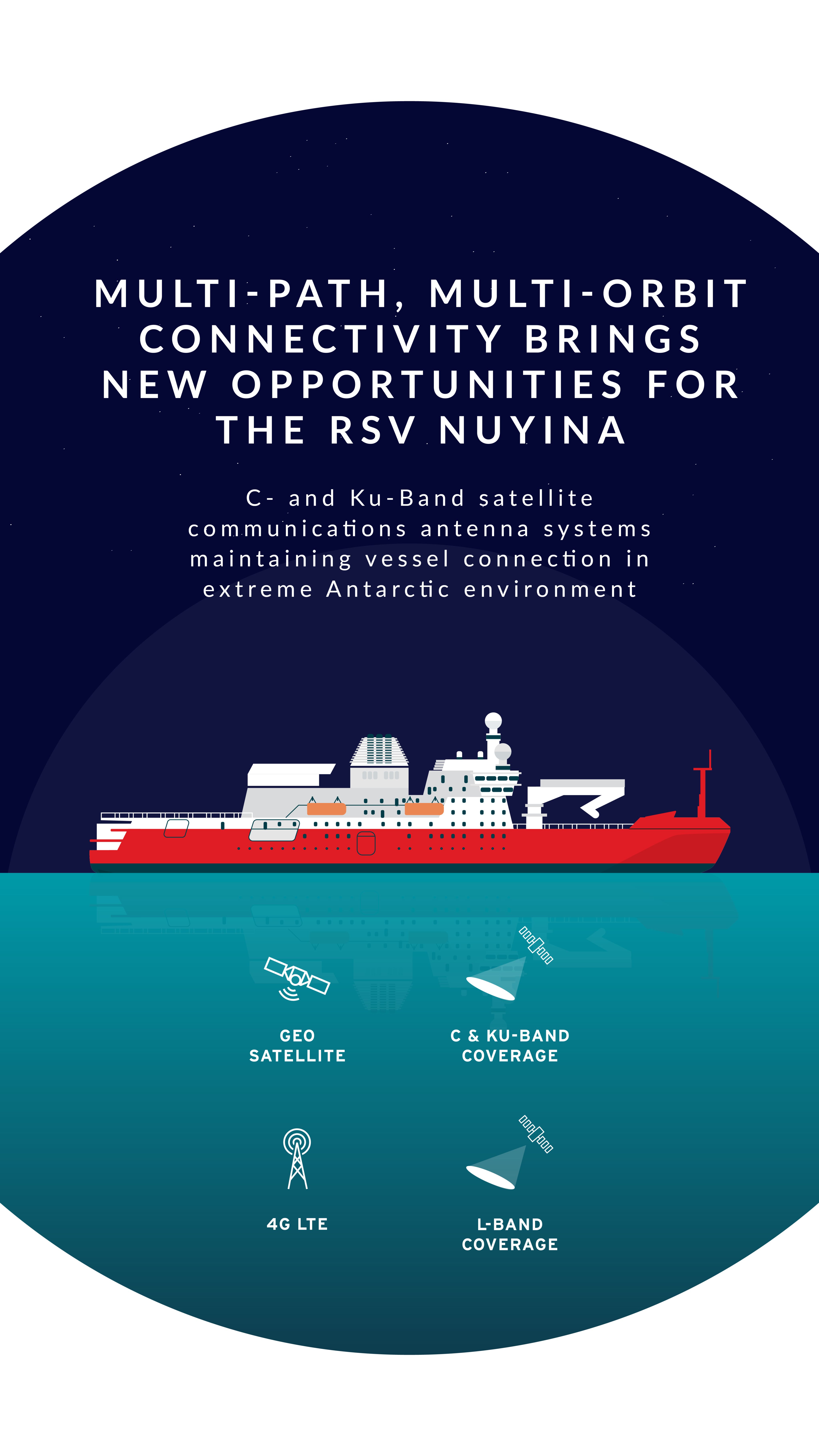 The RSV Nuyina utilizes dual, high-availability, multi-band VSAT antennas with failover to dual LEO constellations. The system has the capability to utilize six (6) different GEO satellite beams across two (2) different VSAT technology platforms.